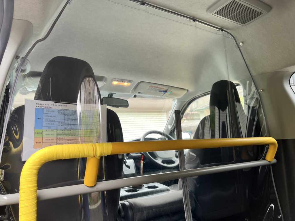 - 運転手席と、後部座席の間に飛沫防止セパレートを設置しております。後部座席とのコミュニケーションが取りづらくなることがありますので、コールボタンを準備しております。