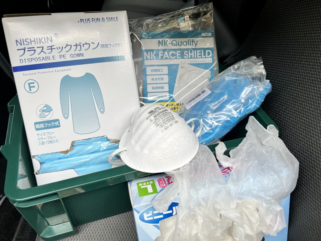 - 感染予防着として、使い捨て予防着・キャップ・N95マスク・フェイスシールド・ディスポグローブを常時設置してあります。
