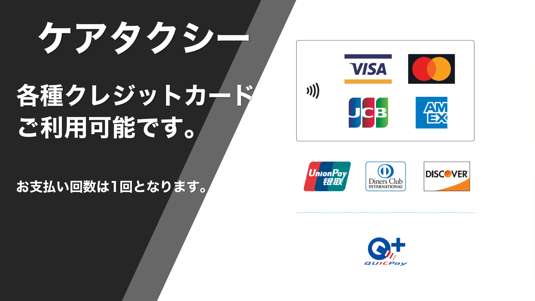 ケアタクシーご利用時、各種クレジットカードでのお支払いが可能となりましたのでお気軽にお申し付けください。